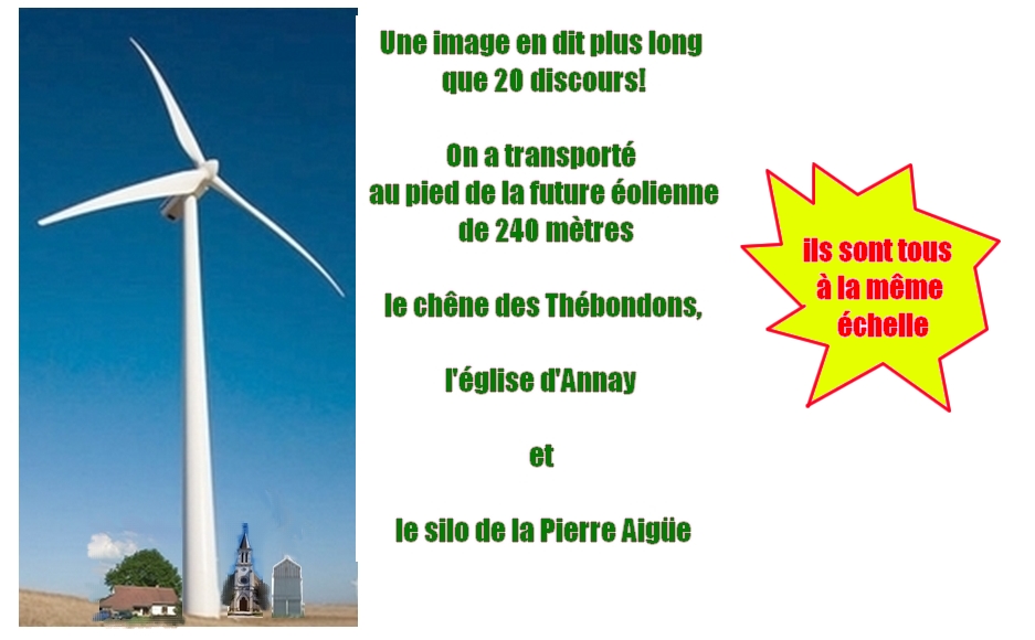 La pollution au CO2 va augmenter de une à dix fois avec l'obligation de mettre en route des centrales à gaz ou à charbon alors que la centrale nucléaire toute proche est apte à nous fournir toute l'énergie électrique désirée sans CO2. | Notre commune rurale héberge des centaines de vaches qui n'ont rien demandé et qui vont être obligées de s'adapter à des objets très pertubateurs de leur environnement comme l'a montré l'intervention de l'agricultrice qui est venue témoigner de son désarroi aux 120 personnes de la réunion d'information que nous avions organisée le 12 novembre à la mairie d'Annay. |
